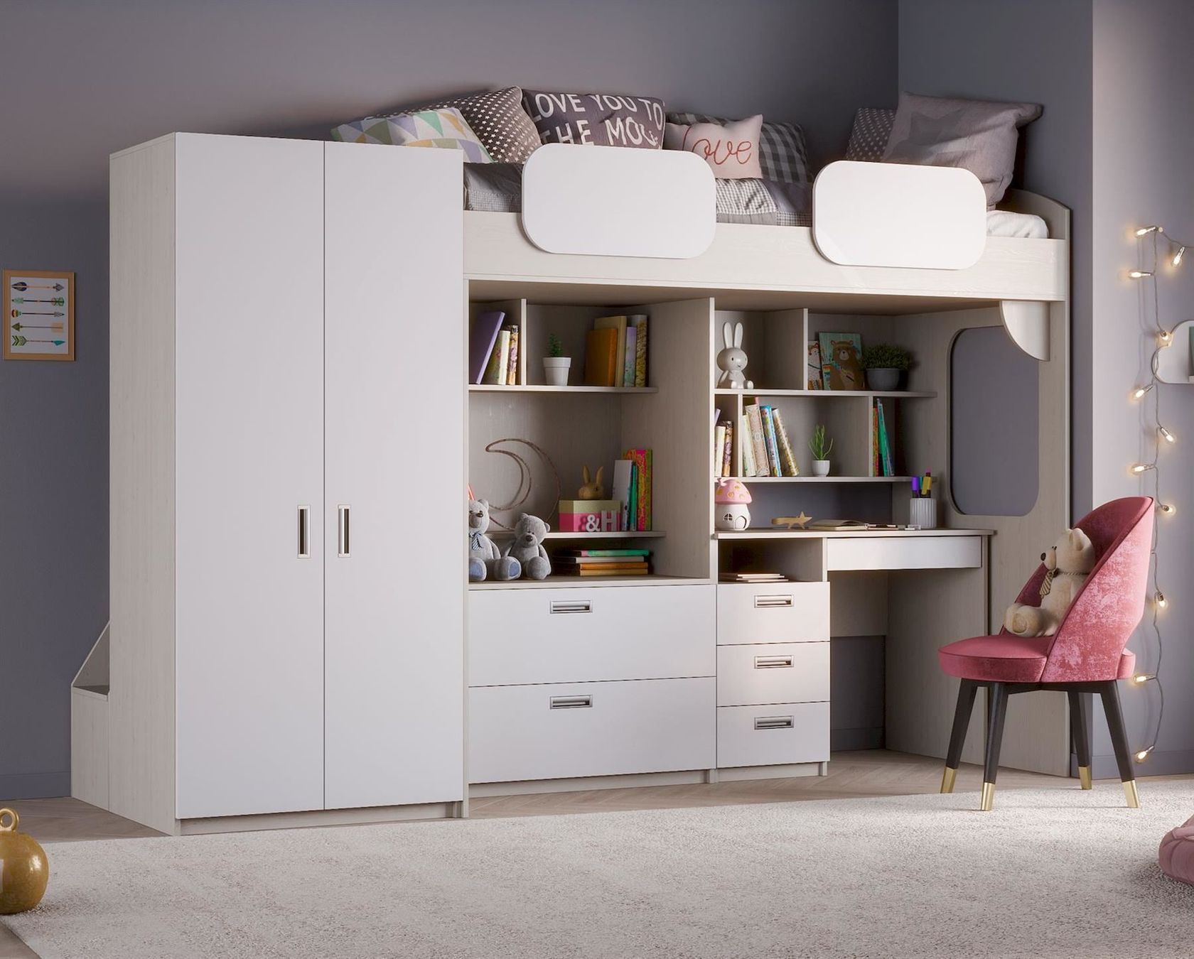 Hochbett mit schrank und funktionalen treppenstufen.